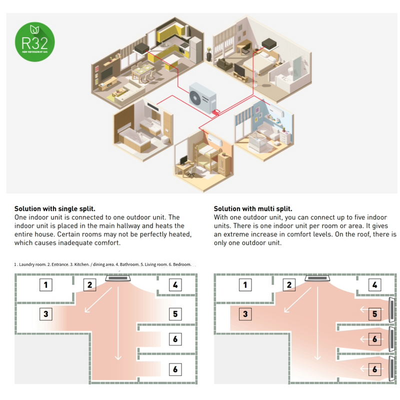 The Panasonic Free Multi System offers the ultimate in flexibility, efficiency, and comfort for your home or office. With the ability to connect up to five indoor units to a single compact outdoor unit, you can enjoy customised heating and cooling in every room without cluttering your exterior. Unlike traditional single split systems—where one indoor unit connects to one outdoor unit, often leaving some areas inadequately heated or cooled—the multi split system ensures consistent comfort throughout your space.